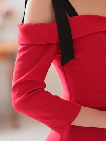 XSあり!オフショル風デザインでセクシーに肌見せ♡ 【Andy/アンディ】リボン ベルト ジップデザイン 肩あき バックル ツートンカラー 袖あり タイトミニドレス(anon2870)