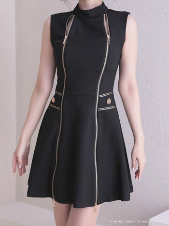露出をお好みで調整♪ 【Andy/アンディ】ノースリーブ バイカラー ハイネック ダブル ジップデザイン 飾りボタン フレアミニドレス(anon2900)