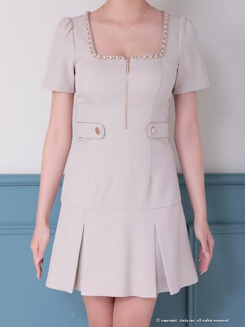 上品なデザインが魅力的なドレス♡ 【Andy/アンディ】ジップデザイン 半袖 プリーツ 飾りボタン スクエアネック ワンカラー フレアミニドレス(anon2911)