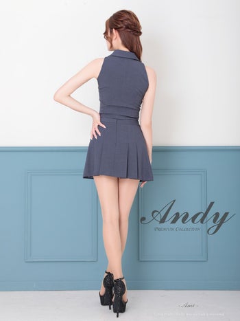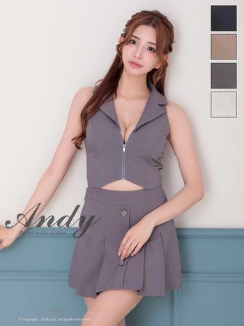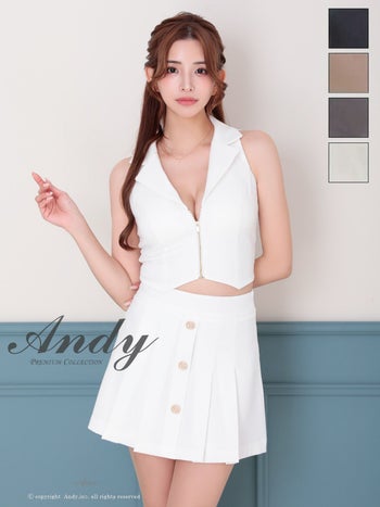 キャバドレス Andy アンディ プリーツ 襟付き 飾りボタン ジップデザイン セットアップ ノースリーブ フレアミニドレス
