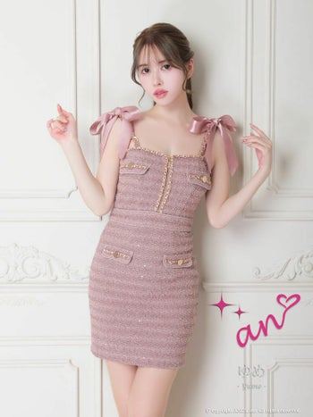 XSあり!ゴールドチェーンが高級感溢れる♪ 【an/アン】ゴールドチェーン ジップデザイン キャミソール リボン ツイード タイトミニドレス (AOC-3584)