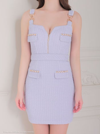 XSあり!ガーリーにもセクシーにもなれる♪ 【an/アン】飾りポケット バックル ノースリーブ チェーン ジップデザイン スーパーストレッチ ツイード リボン タイトミニドレス(aoc3645)