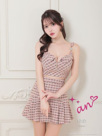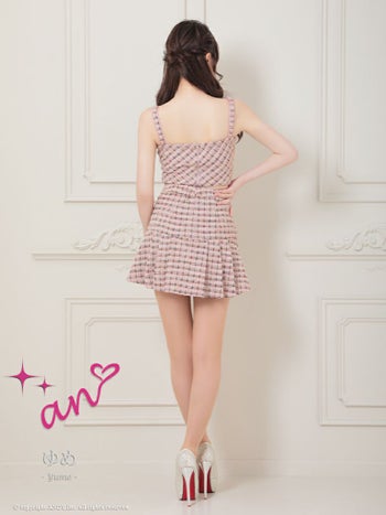 キャバドレス an アン ジップデザイン ツイード チェック柄 バックル キャミソール プリーツ セットアップ フレアミニドレス