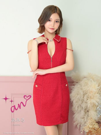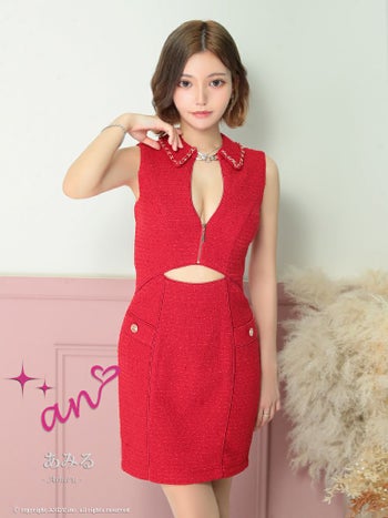 キャバドレス タイトミニドレス an アン チェーン ツイード ノースリーブ ジップデザイン 襟付き