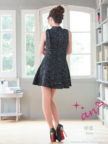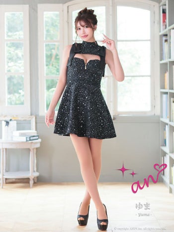 キャバドレス フレアミニドレス an アン ノースリーブ ジップデザイン リボン スパンコール Aライン