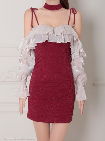 2WAY パール ラメ フリル 長袖 オフショルダー キャミソール タイトミニドレスのメイン画像1
