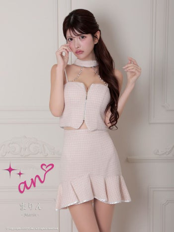 キャバドレス an ガーリー ホルターネック セットアップ ジップデザイン ツイード チェーン フリル タイトミニドレス