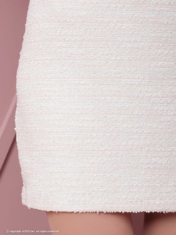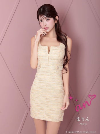 キャバドレス an ガーリー ノースリーブ ジップデザイン ツイード スクエアネック ウエストマーク パールボタン タイトミニドレス