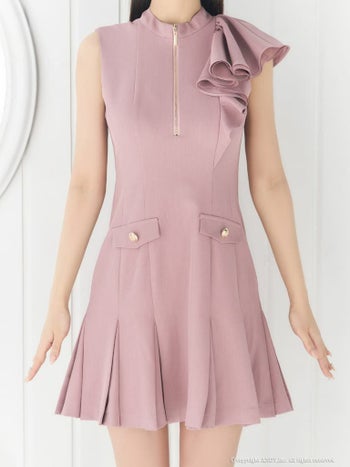 ガーリー ノースリーブ ジップデザイン ポケット ショルダー フリル プリーツ フレアミニドレスのメイン画像1