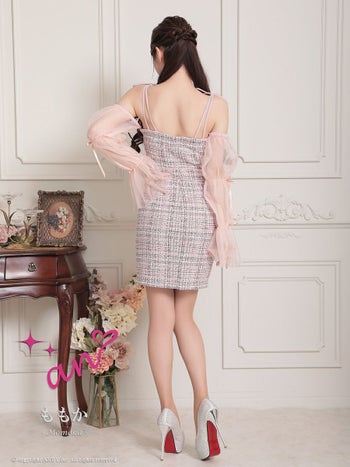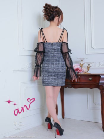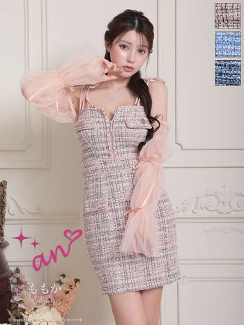 キャバドレス タイトミニドレス an アン チュールスリーブ ツイード リボン ジップデザイン 飾りポケット キャミソール