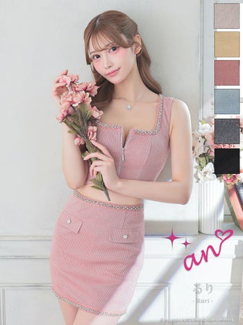 キャバドレス タイトミニドレス an アン ジップデザイン セットアップ ノースリーブ ワンカラー ビジュー 飾りポケット スクエアネック ラメ