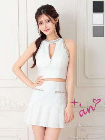 XSあり!大胆に開いた谷間で周りの視線を集める♡ 【an/アン】ジップデザイン ノースリーブ セットアップ ビジュー カットデザイン フレアミニドレス(aoc3896)