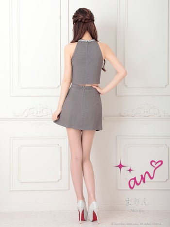 3. 【an/アン】スパンコール ノースリーブ リボン ビジュー ワンカラー ハーフプリーツ ジップデザイン セットアップ フレアミニドレス(aoc3905)