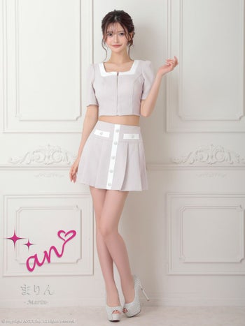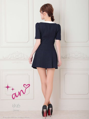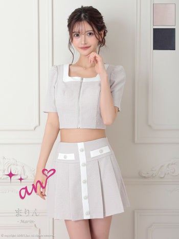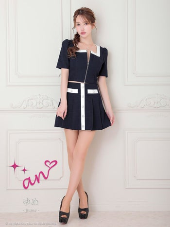 キャバドレス an アン セットアップ ジップデザイン 袖あり バイカラー スクエアネック 飾りポケット 飾りボタン プリーツ フレアミニドレス
