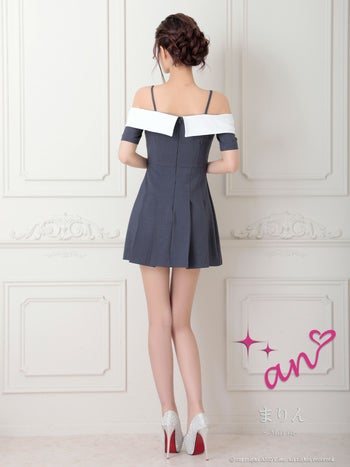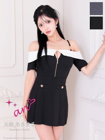 キャバドレス an アン 半袖 肩あき バイカラー ジップデザイン 飾りボタン フレアミニドレス