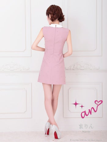 キャバドレス an アン リボン ビジュー ジップデザイン 襟付き くびれ透け ノースリーブ タイトミニドレス