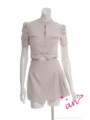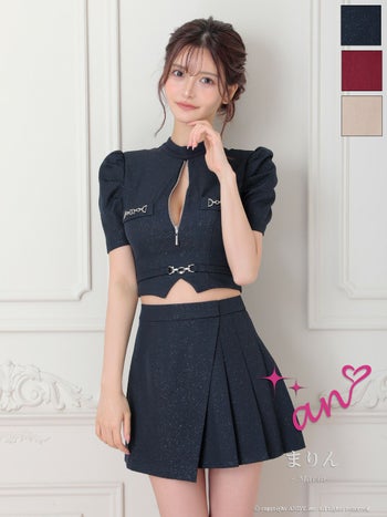 XSあり!トップス裾のVカットデザインがさりげない可愛さ♡ 【an/アン】パフスリーブ チェーン アシンメトリー ラメ セットアップ ジップデザイン 半袖 フレアミニドレス(aoc3932)