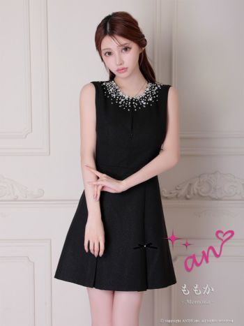 XSあり!背中開きデザインで後ろ姿まで綺麗に魅せる♪ 【an/アン】ノースリーブ ジップデザイン バックカット プリーツ リボン ビジュー フレアミニドレス(aoc4027)