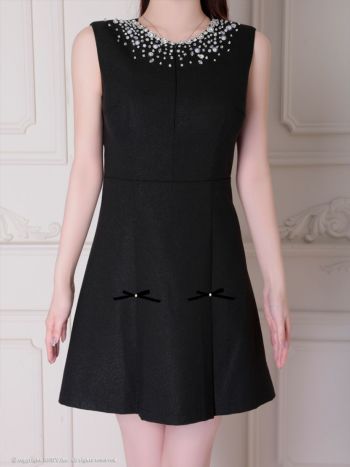 4. 【an/アン】ノースリーブ ジップデザイン バックカット プリーツ リボン ビジュー フレアミニドレス(aoc4027)
