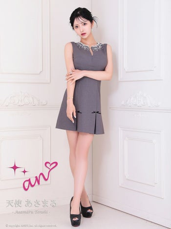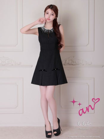 キャバドレス an ジップデザイン バックカット ノースリーブ プリーツ リボン ビジュー フレアミニドレス
