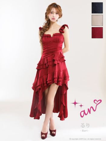 XSあり!デコルテを綺麗に魅せる♪ 【an/アン】2way キャミソール ベアトップ ジップデザイン ビジュー ドット柄 フリル ティアード タック ロングテールドレス(aoc4041)