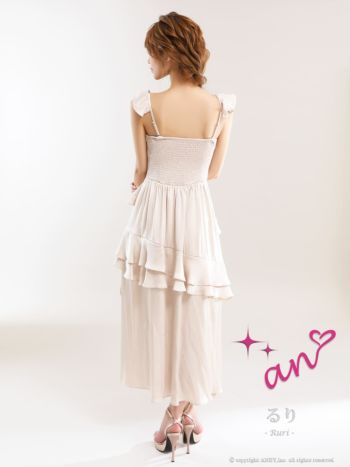 4. 【an/アン】2way キャミソール ベアトップ ジップデザイン ビジュー ドット柄 フリル ティアード タック ロングテールドレス(aoc4041)