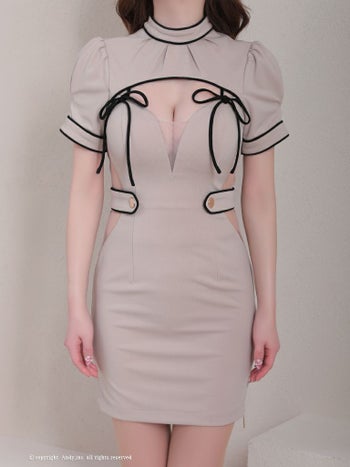 リボン 半袖 くびれ透け バイカラー ハイネック パフスリーブ タイトミニドレスの詳細画像