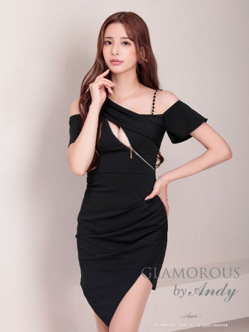 キャバドレス タイトミaニドレス GLAMOROUS グラマラス アシンメトリー オフショルダー ジップデザイン チェーン