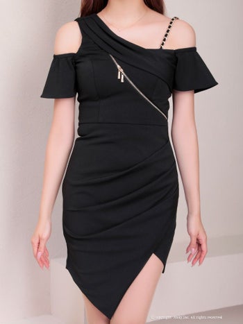 アシンメトリー オフショルダー ジップデザイン チェーン タイトミニドレスの全身フロント画像1
