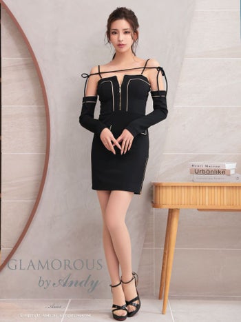 キャバドレス GLAMOROUS 長袖 リボン ポケット 肩あき バイカラー ジップデザイン タイトミニドレス
