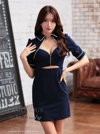 3. 【GLAMOROUS/グラマラス】ジップデザイン 袖あり 襟付き カットデザイン バイカラー タイトミニドレス(gmsv851)