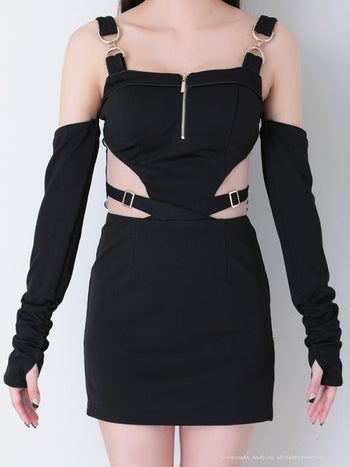 肩あき 長袖 ノースリーブ くびれ透け ジップデザイン スクエアネック カットデザイン タイトミニドレスのメイン画像1