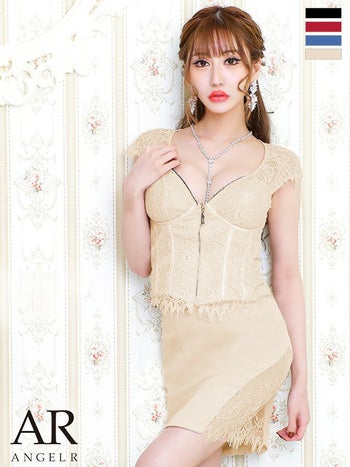 3. 【Angel R/エンジェルアール】バストチェーンビジュー フロントジッパー エレガント レース セットアップ 袖あり タイトミニドレス(AR20342)
