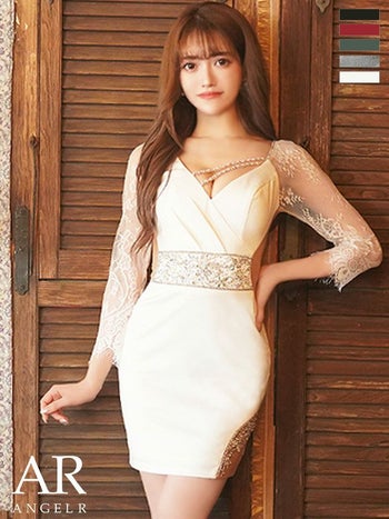 4. 【Angel R/エンジェルアール】リッチ バスト ラインビジュー フラワーレース 袖あり タイトミニドレス (AR22844)
