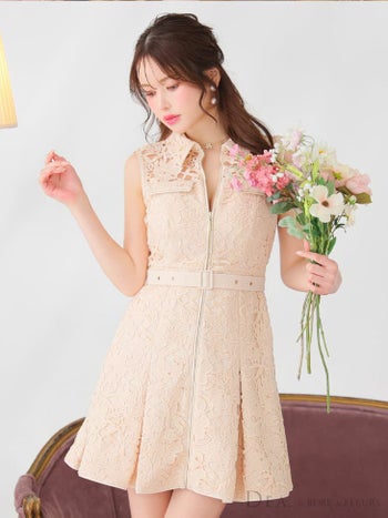 キャバドレス ブランド ベルト ジップデザイン ガーリー ノースリーブ レース フレアミニドレス
