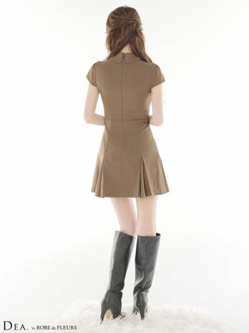 3. 【DEA.by ROBE de FLEURS/ディア】ジップデザイン 半袖 ウエストボタン ラメツイル プリーツスカート 襟付き フレアミニドレス (DE4312)