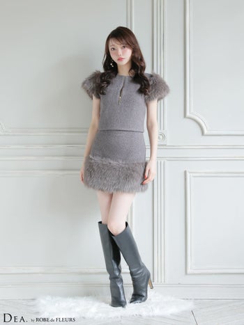 4. 【DEA.by ROBE de FLEURS/ディア】ブークレニットツイード 袖あり セットアップ ジップデザイン 袖ファー タイトミニドレス (DE4601)