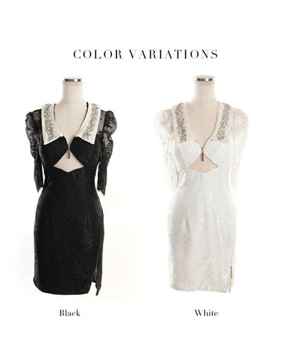 4. 【Glossy by ROBE de FLEURS/グロッシー】 ビジュー付き襟モチーフ ジップデザイン レース袖あり タイトミニドレス(GL2468)