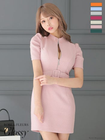 XSあり!大人気カラーが登場♪ 【Glossy by ROBE de FLEURS/グロッシー】シンプル フロントバストジッパー ウエストベルト風デザイン ペチコート付き スプリング ツイード タイトミニドレス(GL2918)