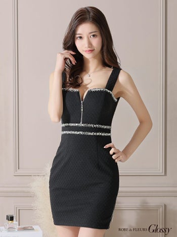 キャバドレス Glossy ROBE de FLEURS グロッシー ローブドフルール ワッフル生地 ワンカラー ジップデザイン セクシー ノースリーブ ビジューライン タイトミニドレス