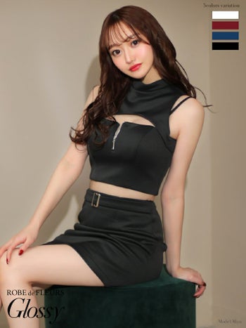3. 【Glossy by ROBE de FLEURS/グロッシー】フロント ジップ ファスナーノースリーブ ペチコート付き ストレッチ ショート セットアップ タイトミニドレス(GL3227)