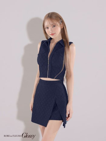 3. 【Glossy by ROBE de FLEURS/グロッシー】ジャガードニット ジップデザイン セットアップ ワンカラー ノースリーブ 襟付き ラップスカート タイトミニドレス(GL3261)