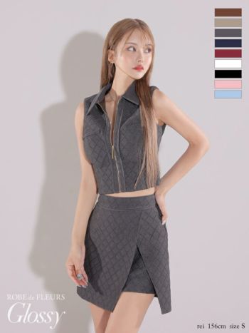 3. 【Glossy by ROBE de FLEURS/グロッシー】セットアップ ワンカラー ジャガードニット ジップデザイン ノースリーブ 襟付き ラップスカート タイトミニドレス(GL3261)