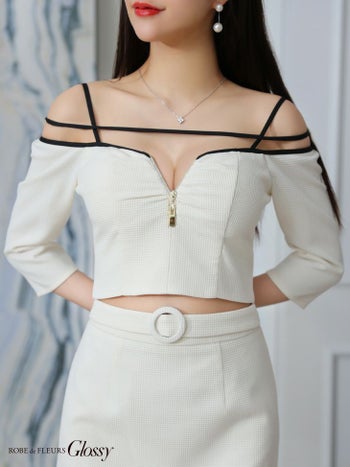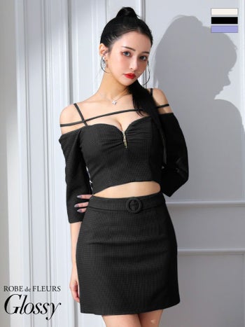5. 【Glossy by ROBE de FLEURS/グロッシー】オフショルダー ジップデザイン ワッフル生地 袖あり セットアップ タイトミニドレス(GL3527)