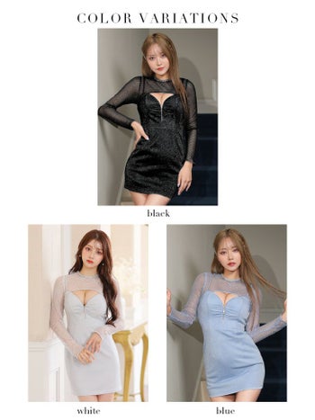 3. 【Glossy by ROBE de FLEURS/グロッシー】メッシュスリーブ セクシー ストーン 長袖 ラメ ニット ジップデザイン タイトミニドレス (GL3555)