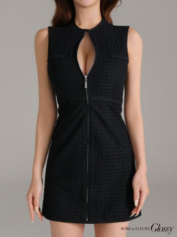 XSあり!ジップデザインで胸元SEXY☆ 【Glossy by ROBE de FLEURS/グロッシー】ジップデザイン ノースリーブ ツイル ラメニット レース セクシー オープンバスト タイトミニドレス (GL3580)