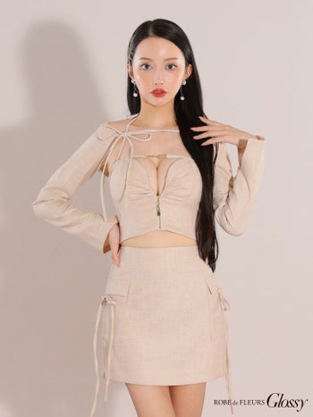 5. 【Glossy by ROBE de FLEURS/グロッシー】2way 長袖 オフショルダー リボン ジップデザイン セットアップ タイトミニドレス (GL3763)