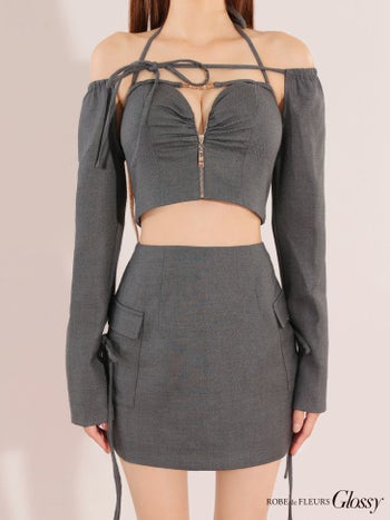5. 【Glossy by ROBE de FLEURS/グロッシー】ストレッチ 2way 長袖 オフショルダー リボン ジップデザイン セットアップ タイトミニドレス (GL3763)