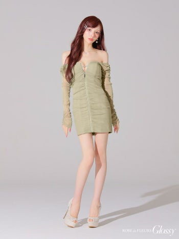 4. 【Glossy by ROBE de FLEURS/グロッシー】ラメチュール ジップデザイン オフショルダー 長袖 タイトミニドレス (GL3926)