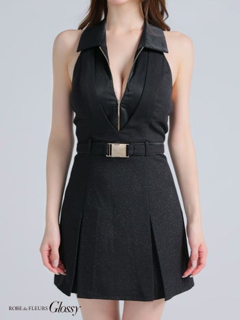 3. 予約商品【2月上旬入荷予定】【Glossy by ROBE de FLEURS/グロッシー】ホルターネック 襟付き ウエストベルト ジップデザイン セクシー フレアミニドレス (GL3937)